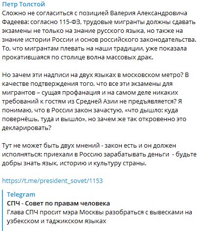 Так Толстой прокомментировал пост СПЧ об узбекских и таджикских надписях в московском метро. Глава Совета Валерий Фадеев направил письмо мэру Москвы Сергею Собянину, в котором сообщил, что данная ситуация очень беспокоит москвичей.