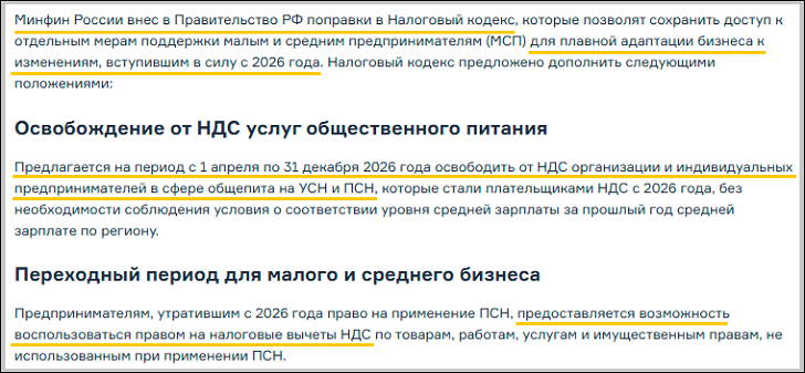 В начале марта Минфин предложил смягчить переход к налоговым изменениям для малого и среднего бизнеса. Если власти примут предложенные поправки в Налоговый кодекс, то с 1 апреля по 31 декабря 2026 года общепит освободят от НДС без необходимости соблюдать условие о соответствии зарплаты за прошлый год средней по региону. Также предусмотрен переходный период с мягкими условиями для малого и среднего бизнеса других направлений.