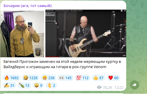 Или вот фотография с недавнего концерта рок-группы Venom. Посмотрите, кто исполняет неистовые партии на гитаре. Пригожин осваивает новые горизонты?