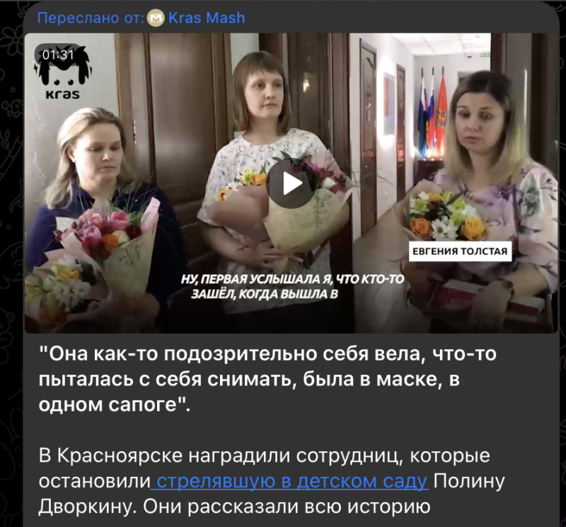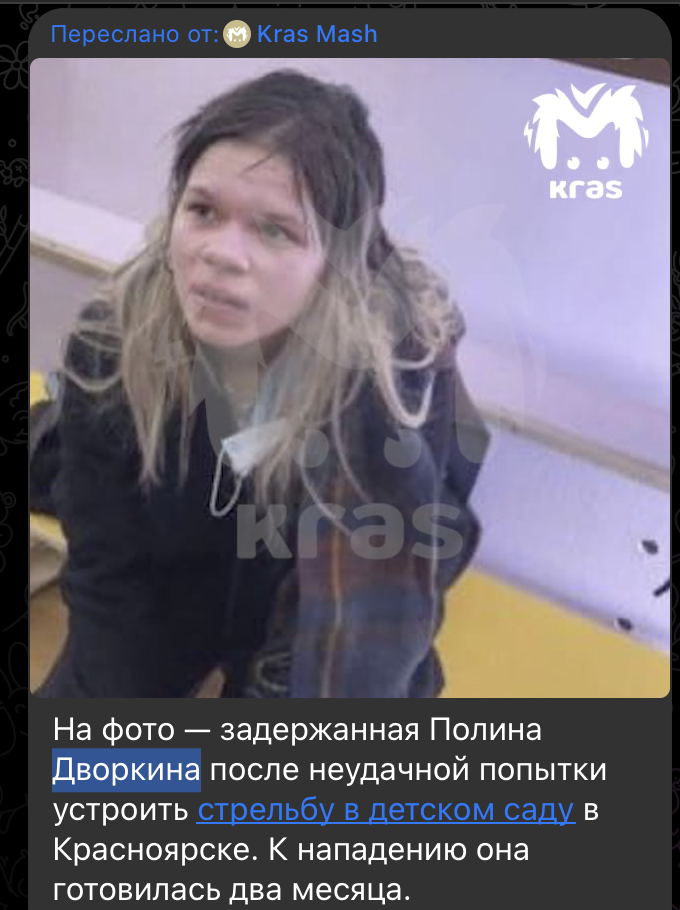 Осенью 2021 года Полина Дворкина приобрела охотничье ружьё, а спустя полгода пришла в детский сад с намерением расправиться с детьми. В 12 лет Полина уже была сторонницей радикального феминизма и решила вести борьбу с мужчинами с раннего возраста.