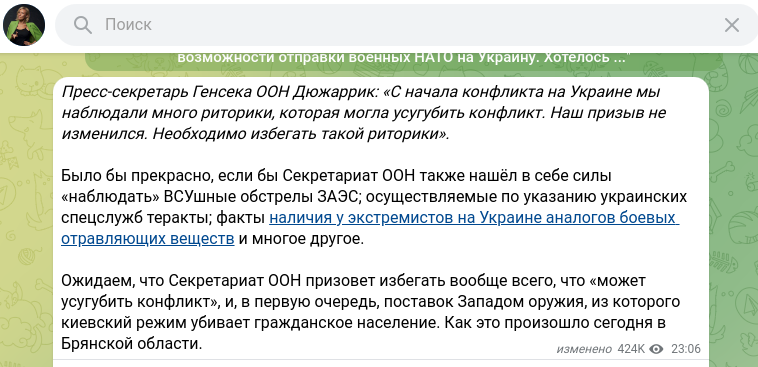 Ожидаем, что Секретариат ООН призовет избегать вообще всего, что "может усугубить конфликт", и, в первую очередь, поставок Западом оружия, из которого киевский режим убивает гражданское население. Как это произошло сегодня в Брянской области.