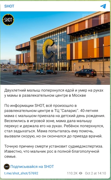 Как передаёт телеграм-канал SHOT, трагедия случилась в московском ТЦ "Саларис": 40-летняя женщина с маленьким сыном пришла в игровую зону центра, где праздновали детский день рождения, а они были гостями.