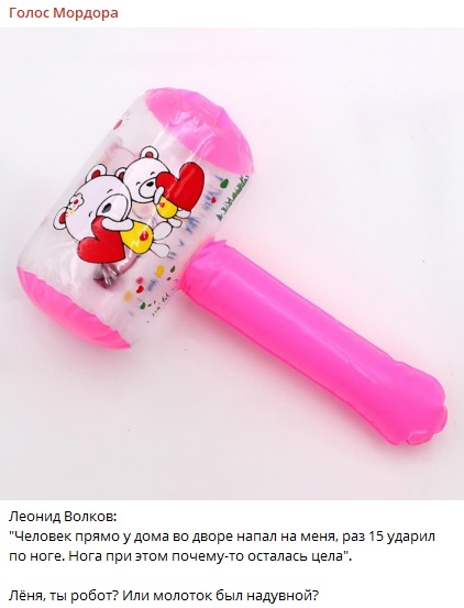 Волков*, видимо, решил прояснить ситуацию и поделился дополнительными подробностями случившегося. По его словам, неизвестный напал на него с молотком для отбивных и раз 15 ударил по ноге, но нога почему-то осталась цела.
