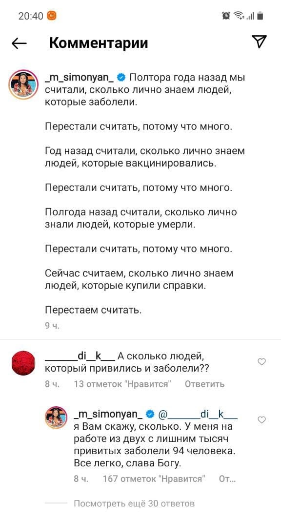 Главред RT Маргарита Симоньян ответила на вопрос о том, сколько сотрудников телеканала сделали прививку от коронавируса и всё равно заболели. Информация была опубликована в комментариях в Instagram.