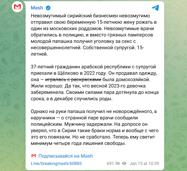 Очередной пример столкновения очень разных культур - в московский роддом мигрант привёз свою 15-летнюю жену. И сильно удивился, когда врачи вызвали полицию и оказалось, что счастливому папаше и мужу грозит тюрьма. К тому же выяснилось, что взял он в жёны 14-летнюю и искренне не понимает, какие к нему могут быть претензии.