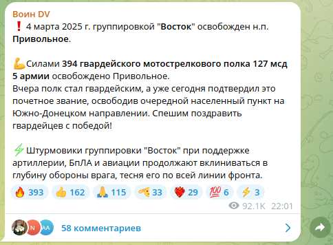 Первая информация об этом просочилась в Сеть накануне вечером. "Воин DV" сообщил, что "4 марта 2025 г. группировкой "Восток" освобожден н.п. Привольное".