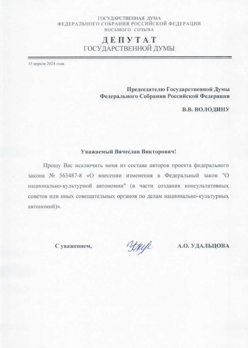 Анастасия Удальцова отозвала свою подпись под скандальным законопроектом "О внесении изменения в Федеральный закон "О национально-культурной автономии". Под давлением общественного мнения депутат признала свою неправоту. Документ получил негативную реакцию в соцсетях, его назвали "вредительским и русофобским".
