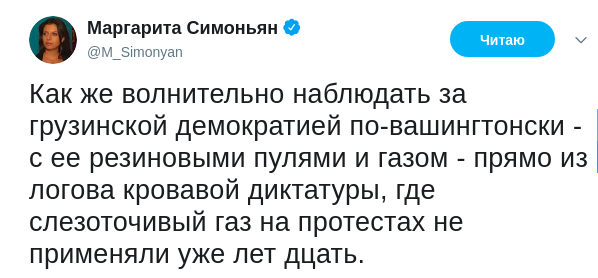 Главред RT Маргарита Симоньян у себя на странице в соцсети иронично и весьма эмоционально отреагировала на то, как в Грузии разгоняют протестующих резиновыми пулями и слезоточивым газом. По её словам, "за грузинской демократией по-вашингтонски" волнительно наблюдать "прямо из логова кровавой диктатуры".