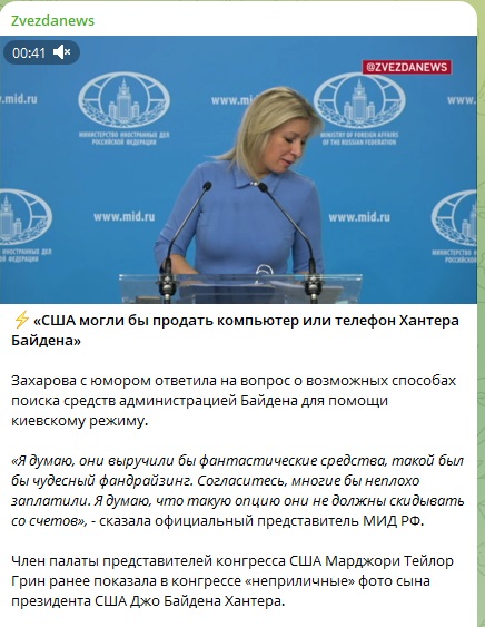 Официальный представитель МИД России Мария Захарова дала семейству Байденов шутливую подсказку, как помочь киевскому режиму деньгами. Она посоветовала продать телефон или компьютер сына американского президента - Хантер Байден "прославился" тем, что постоянно попадает в скандалы.