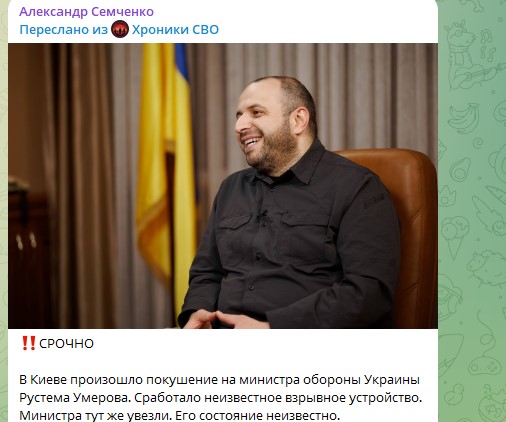 Источник сообщил о покушении на министра обороны Украины Рустема Умерова с применением взрывного устройства.