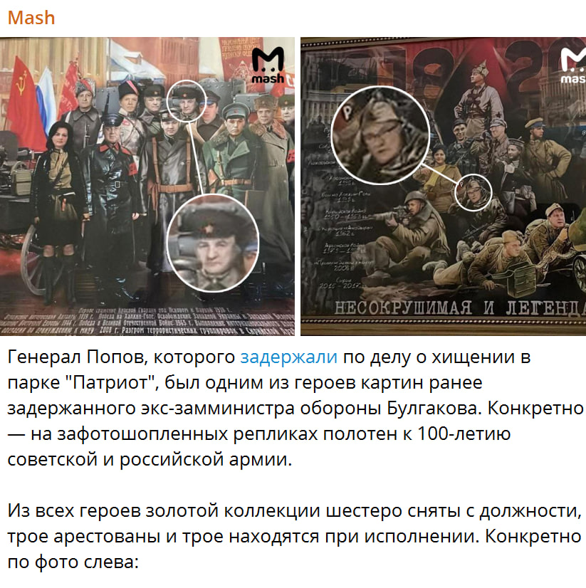 Тем временем внимательные журналисты обнаружили примечательную деталь. На зафотошопленных репликах полотен к 100-летию советской и российской армии, ранее обнаруженных в доме также бывшего замминистра обороны Дмитрия Булгакова, есть портрет Попова.