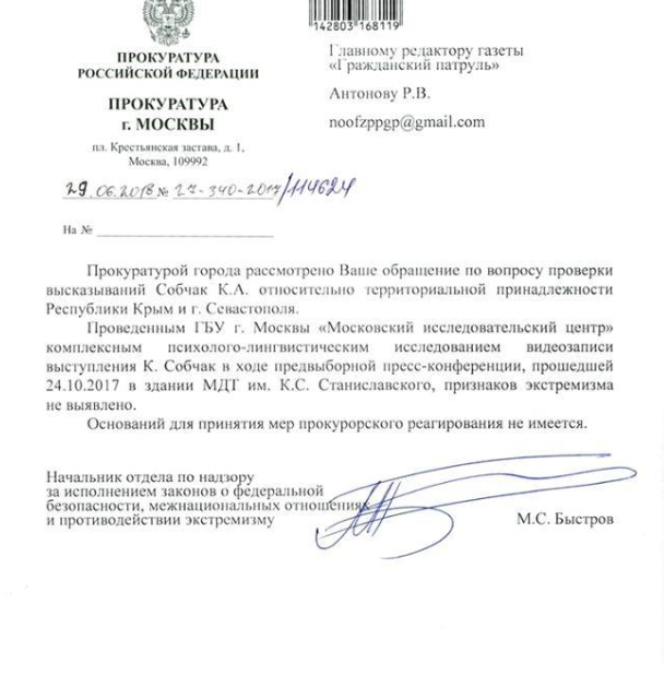 Сегодня глава общественной организации Ростислав Антонов получил документ из ведомства, согласно которому прокуратура не усмотрела противоправных действий со стороны Собчак.