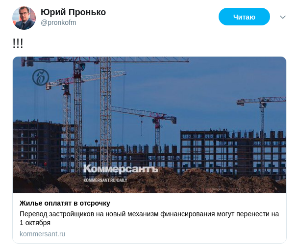 СМИ сообщили о том, что срок перехода застройщиков на новые правила с использованием эскроу-счетов, может быть сорван и перенесён с 1 июля на 1 октября этого года. Экономический обозреватель Царьграда Юрий Пронько в ответ не сдержал эмоций и буквально без слов прокомментировал эту информацию - только знаками препинания.
