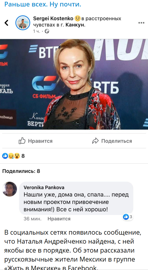 В социальных сетях появилось сообщение, что Наталья Андрейченко найдена, с ней якобы всё в порядке. Однако официального подтверждения от менеджера актрисы пока нет.