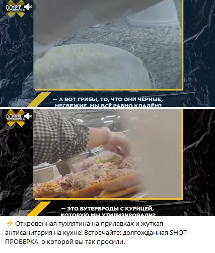 Оказалось, что в магазинах, куда внедрились агенты, организовано "безотходное производство". Секрет его прост. Пропавшую курицу отправляют в бутерброды, скисшую колбасу и почерневшие грибы - в пиццу и так далее. И это без учёта перебивки даты производства продуктов. Об этом без стеснения рассказывают повара, не зная, что их снимают.