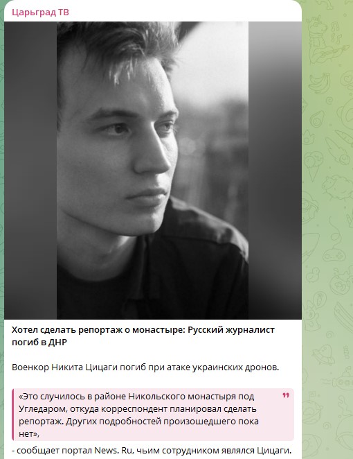 Сегодня во время атаки украинского дрона он погиб. Никите Цицаги было 29 лет. В зоне боевых действий в ДНР он работал с 2022 года.