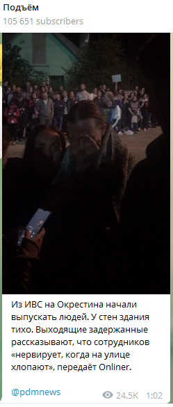 Как пишет Onliner, людей начали выпускать вскоре после полуночи. Среди встречающих слышны призывы вести себя тихо и не аплодировать. К выходящим подходят люди, предлагают свою помощь, тут же собрались таксисты, готовые развезти отпущенных граждан по домам.