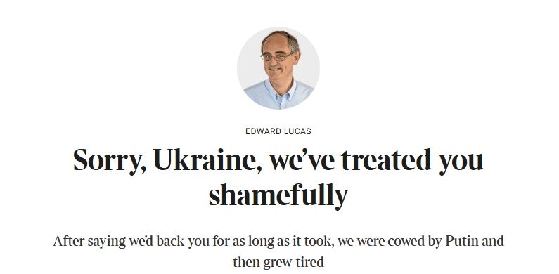 Мы обещали поддерживать Украину "сколько потребуется", не уточнив при этом, как. На практике мы не слишком помогали вам в хорошие времена. В результате времена стали плохие, и мы снова помогаем вам, но опять же не очень-то усердно. Как итог мы имеем пресловутую борьбу до последнего украинца,
