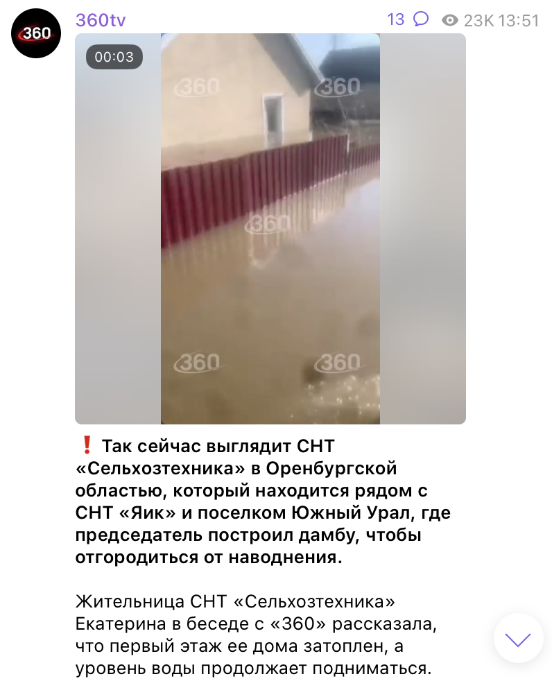 Оренбуржье продолжает затапливать. Скриншот t.me/tv360