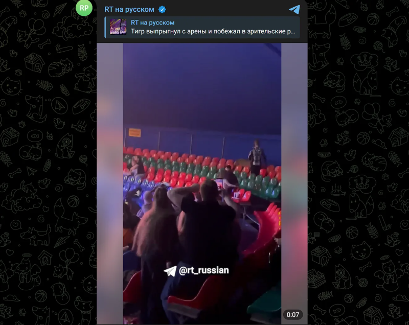 Интересно, что в более раннем сообщении того же RT отмечалось, что людей "быстро вывели из зала", однако более позднее видео показывает, что дрессировщики, наоборот, кричали зрителям: "Не бойтесь, просто сядьте, и всё".