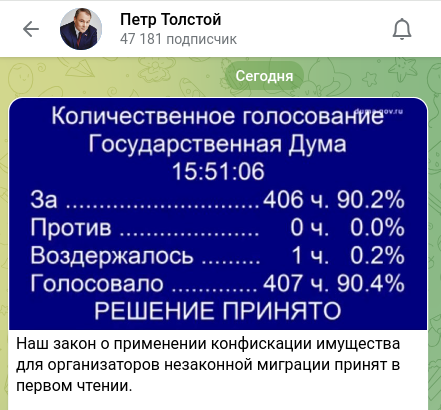 В Госдуме в первом чтении приняли законопроект о конфискации имущества, денег и других ценностей за организацию незаконной миграции. Депутаты взялись за предателей, которые ради личной выгоды организовали нелегальную миграцию в нашу страну. Однако эти меры жители России считают недостаточными и требуют ещё более жёстких решений. В том числе предлагается выгнать мигрантов из России вместе с их семьями.