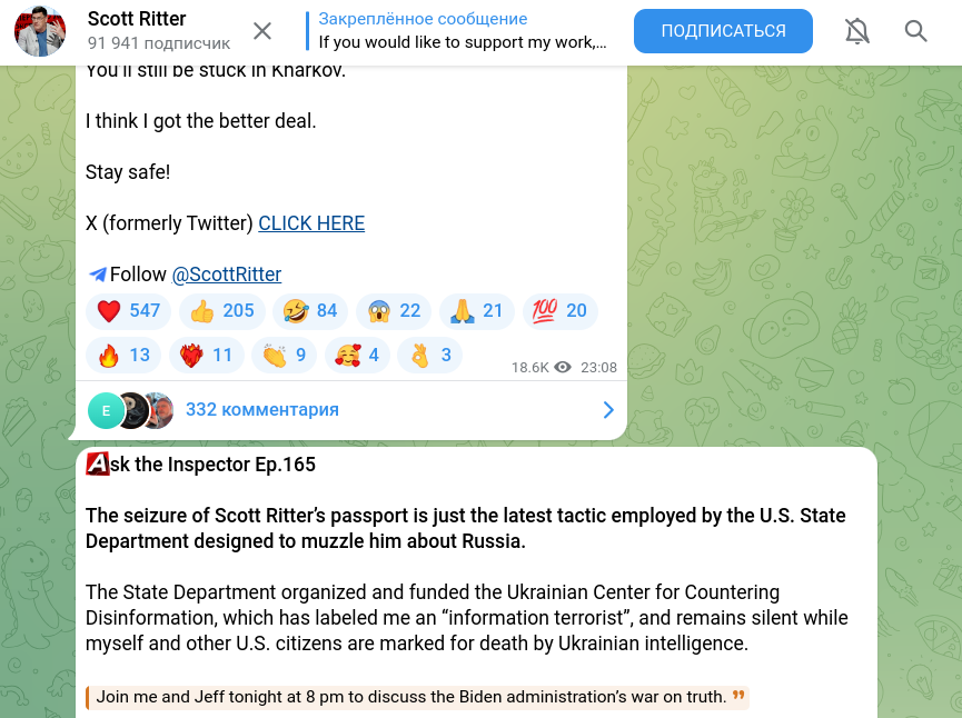 Изъятие паспорта Скотта Риттера - это всего лишь последняя тактика, использованная Государственным департаментом США, призванная заставить его замолчать в отношении России. Госдепартамент организовал и профинансировал Украинский центр по противодействию дезинформации, который назвал меня "информационным террористом" и хранит молчание, в то время как я и другие граждане США приговорены к смерти украинской разведкой.