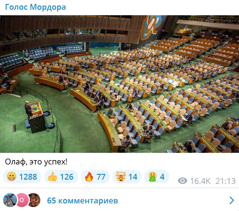 Во время выступления канцлера Германии Олафа Шольца в зале Генассамблеи ООН насчитывалось несколько десятков человек. Фото с выступления широко разошлись по Сети - на нём Шольц стоит перед пустующими рядами и произносит речь.