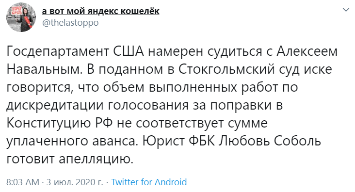 "Госдеп намерен судиться с Алексеем Навальным. В поданном в Стокгольмский суд иске говорится, что объём выполненных работ по дискредитации голосования за поправки к Конституции РФ не соответствует сумме уплаченного аванса", - иронизирует пользователь "А вот мой яндекс-кошелёк".