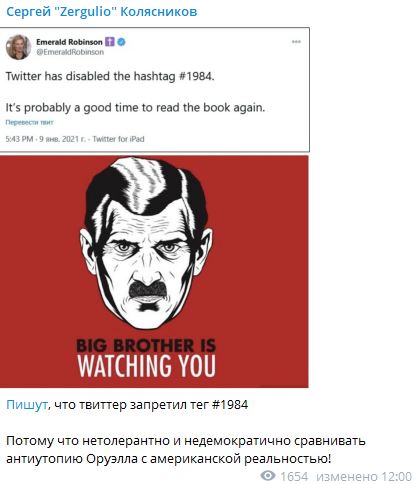 Известный российский блогер Сергей Zergulio Колясников заявил, что сервис микроблогов Twitter запретил хештег #1984. Слишком многие стали сравнивать Америку с антиутопией Джорджа Оруэлла после того как президента США забанили практически во всех известных соцсетях.