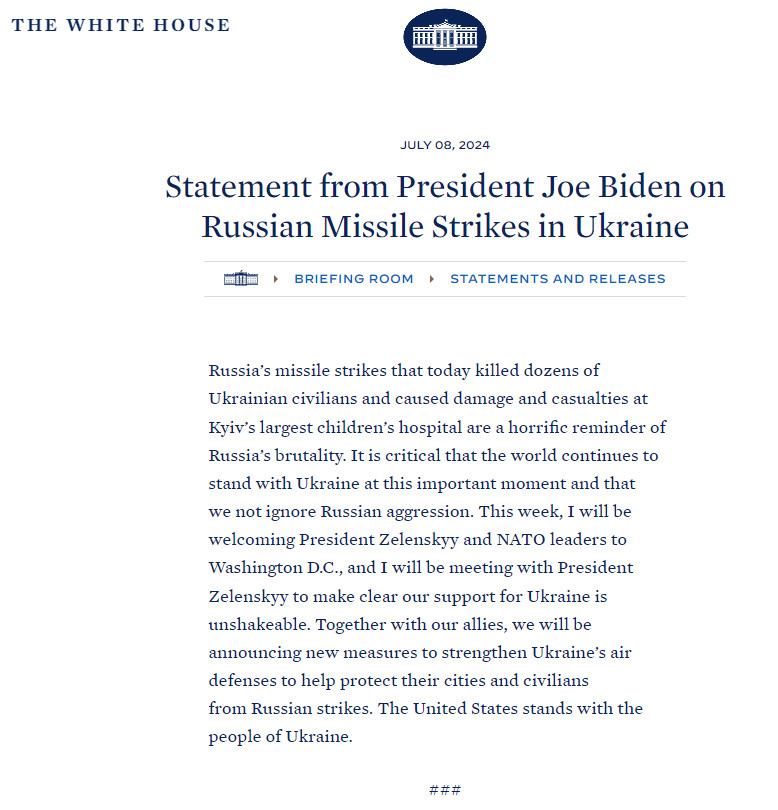Ракетные удары России, в результате которых сегодня погибли десятки мирных жителей Украины и были нанесены повреждения крупнейшей детской больнице Киева, являются ужасающим напоминанием о жестокости России. Крайне важно, чтобы мир продолжал поддерживать Украину в этот важный момент и чтобы мы не игнорировали российскую агрессию,