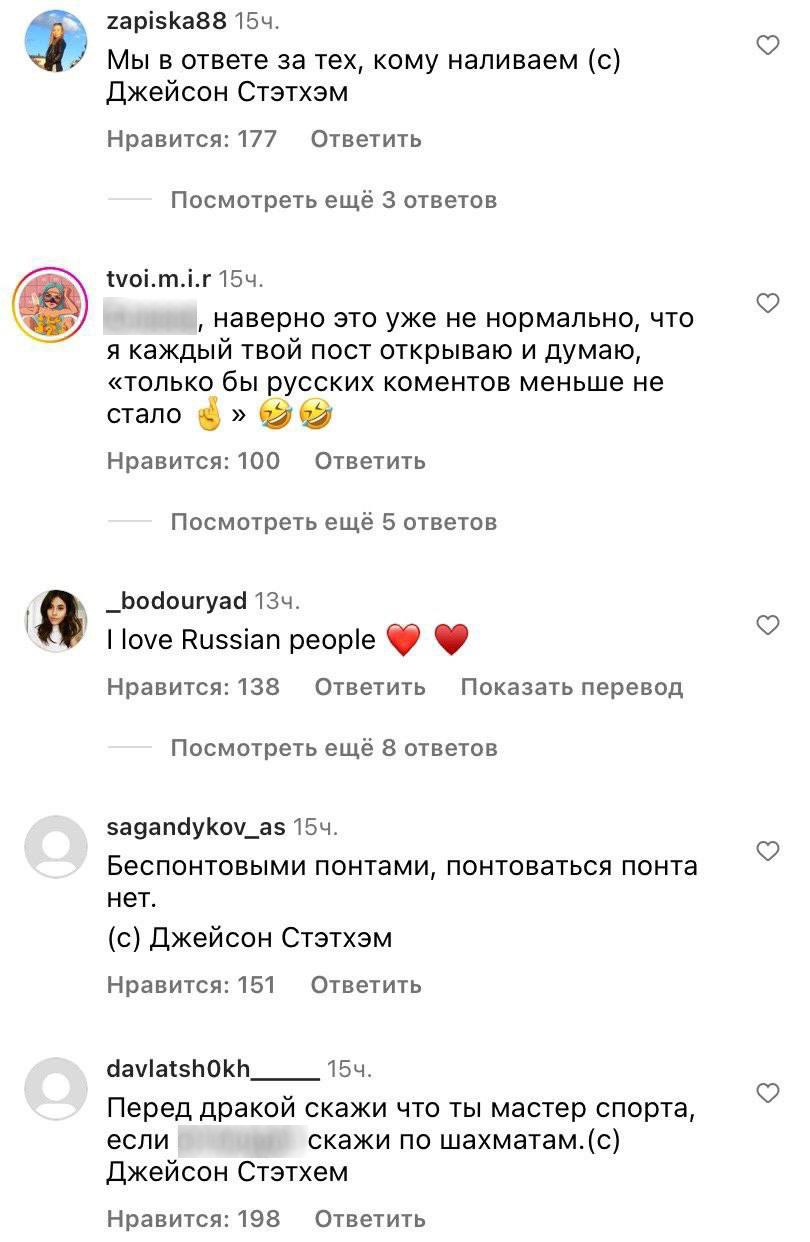 В комментарии к новому посту Джейсона Стэтхема снова пришли русские пользователи и поддержали артиста "мудрыми цитатами":