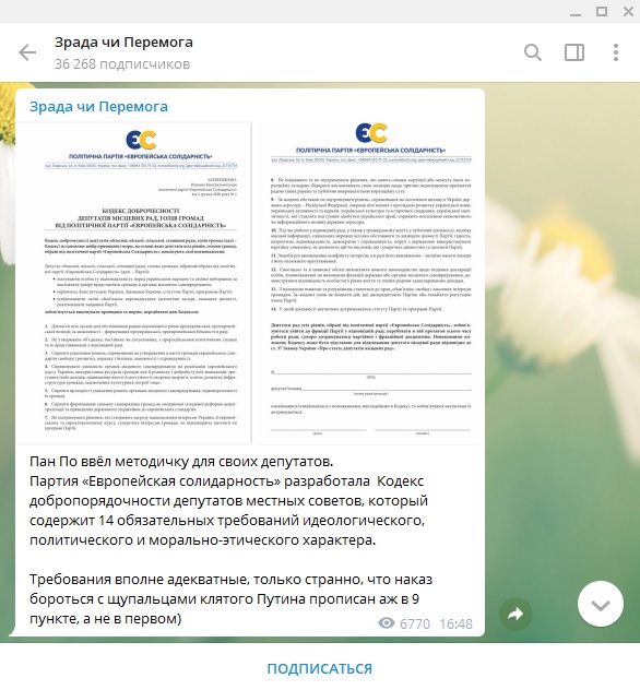 Партия экс-президента Украины Петра Порошенко "Европейская солидарность" ввела "кодекс добропорядочности" для депутатов местных советов. Среди требований под номером 9 идёт борьба с Россией и "агентами Путина".