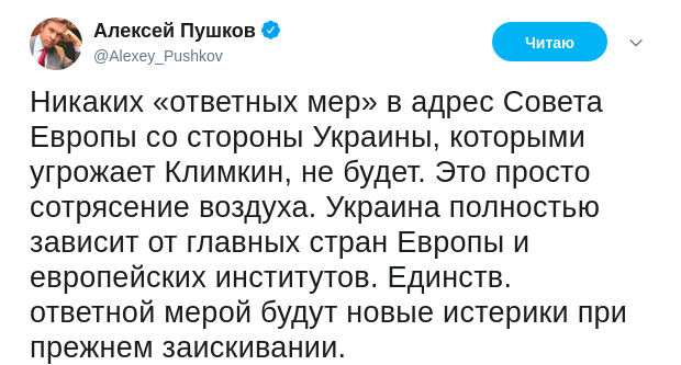 Российский сенатор Алексей Пушков у себя в Twitter ответил на угрозы главы МИД Украины Павла Климкина о возможном возвращении России в ПАСЕ. Российский политик при этом назвал единственный ответ, на который будет способна Украина: "будут новые истерики при прежнем заискивании". Пушков отметил, что Незалежная полностью зависит от Европы.
