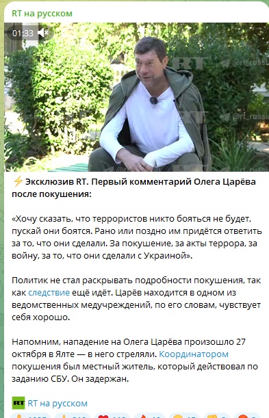 Политик Олег Царёв дал первое интервью после громкого покушения, случившегося в ночь на 27 октября. Он сделал прозрачный намёк на организаторов, назвав их террористами и добавив: "Пускай они боятся".