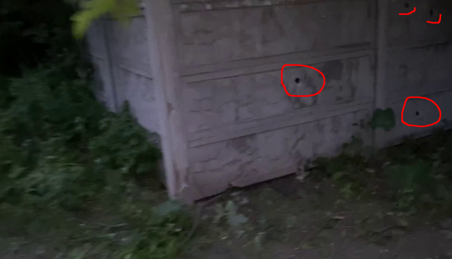 По его словам, всего по этой остановке выпустили шесть снарядов. И один снаряд разорвался и убил осколками. В заборе видны пробитые дырки.