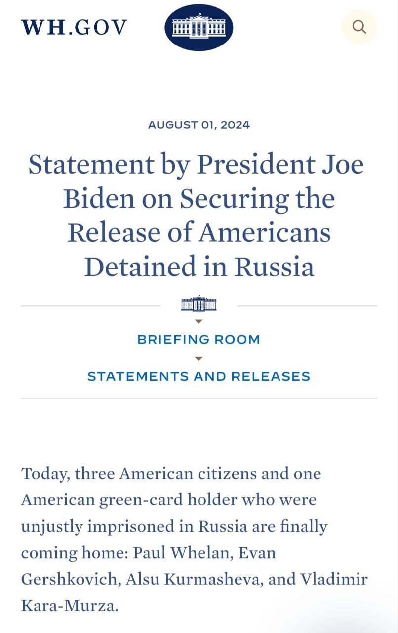 В свою очередь президент США Джо Байден сообщил, что Запад получил назад 16 заключённых. В их числе пять граждан Германии и семь граждан России, которых в Белом доме назвали "политическими заключёнными". Непосредственно США получили четверых заключённых.