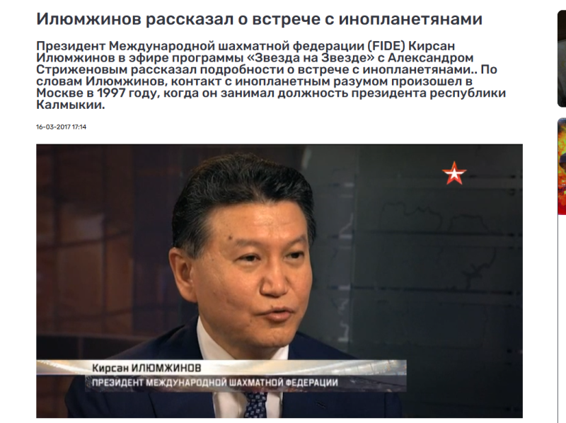 Так, он уже открывал журналистам "сенсацию", утверждая, что общался с инопланетянами. По уверению Илюмжинова, это случилось в 1997-м году в Москве. Пришельцы "жёлтого цвета", говорил бывший чиновник, забрали его на борт "летающей тарелки" и рассказали гостю, что с людьми не вступают в контакт, поскольку человечество находится на слишком малой ступени развития.