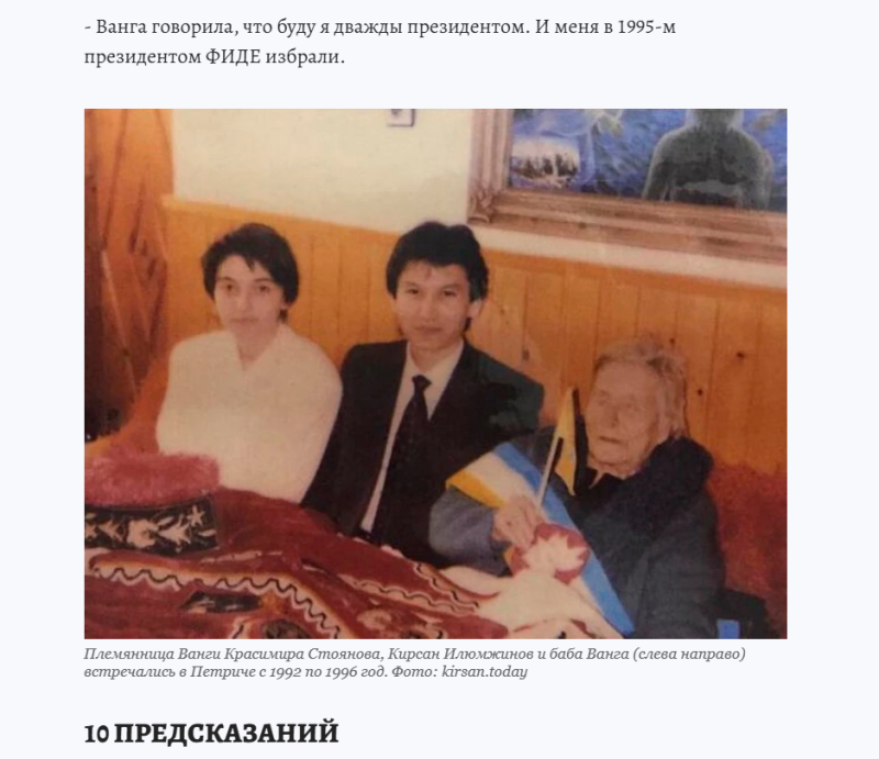 Он добавляет – Ванга любила Россию и говорила, что всем надо эту страну слушаться. Позже, уже став главой Калмыкии, Илюмжинов передавал Ельцину от болгарской прорицательницы "приветы".