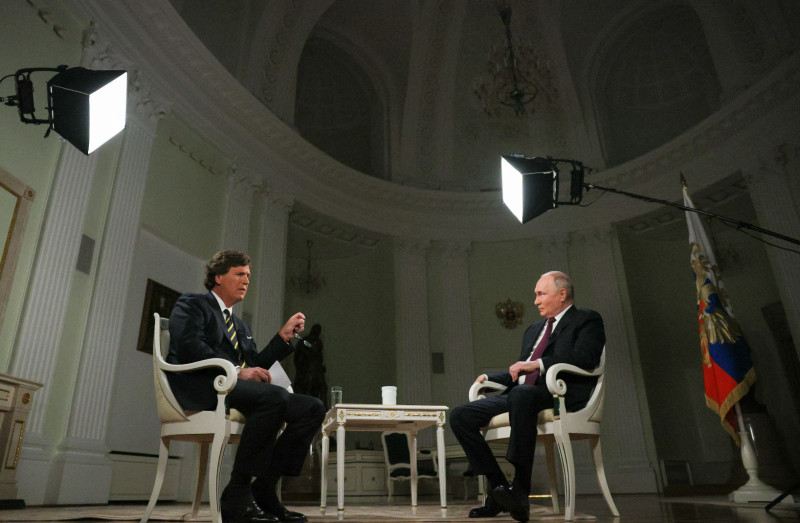 Карлсон зимой 2024 года приехал в Москву и взял интервью у Путина. Бóльшая часть двухчасовой беседы была посвящена военной операции на Украине. Кроме того, президент высказался об отношениях России с НАТО, взрыве на газопроводе "Северный поток", аресте в стране журналиста The Wall Street Journal Эвана Гершковича и на другие темы.