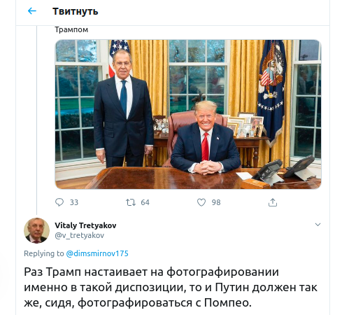 "Раз Трамп настаивает на фотографировании именно в такой диспозиции, то и Путин должен так же сидя фотографироваться с Помпео", - прокомментировал это фото политический эксперт Виталий Третьяков.