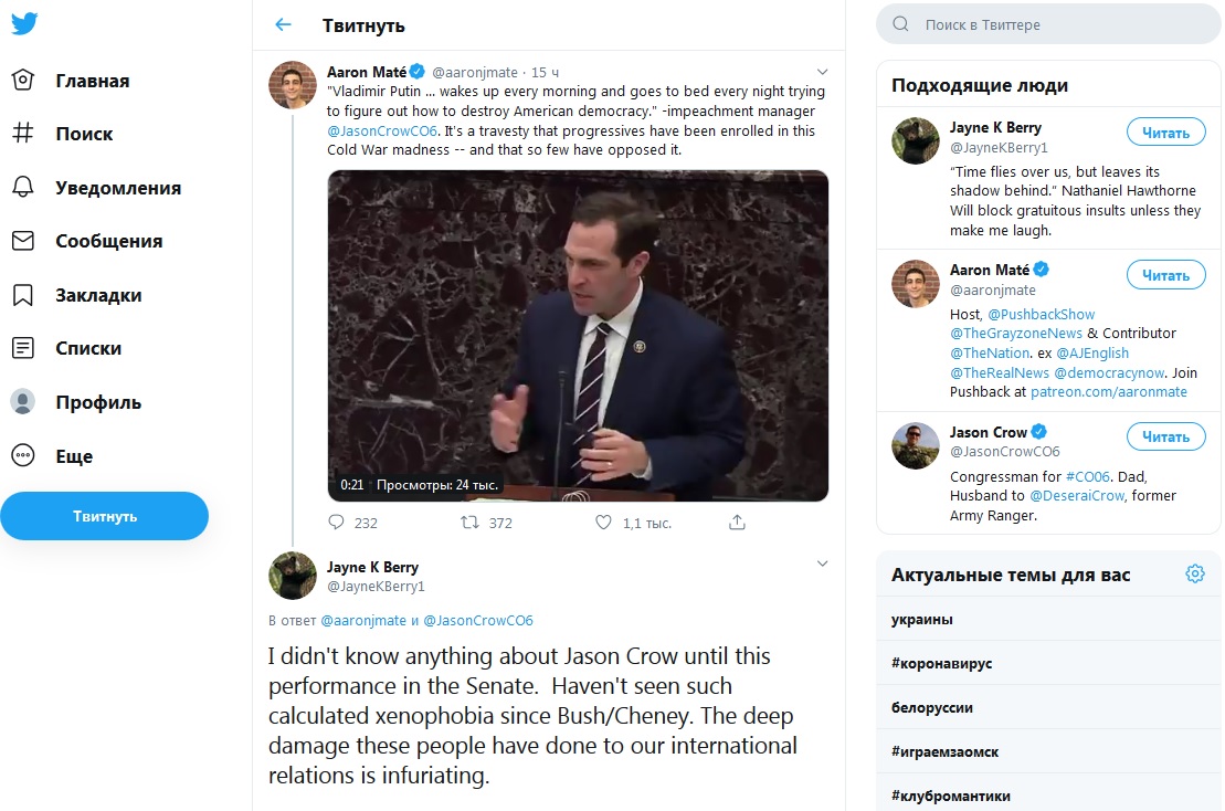 "Я ничего не знал о Джейсоне Кроу до этого выступления в сенате. Не видел такой просчитанной ксенофобии со времён Буша/Чейни. Глубокий ущерб, который эти люди нанесли нашим международным отношениям, приводит в бешенство", - отмечает @JayneKBerry1.