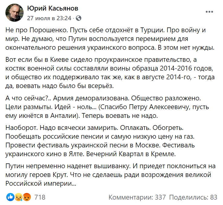 Так Касьянов прокомментировал недавно согласованное перемирие в Донбассе. Он раскритиковал украинские власти за попытки остановить войну. По его словам, если бы в Киеве сидело проукраинское правительство, то "воевать надо было бы всерьёз". А сейчас армия и общество разложены, а цели размыты. Последний пункт активист Майдана записал на счёт экс-президента Украины Петра Порошенко, который подписал Минские соглашения, заморозившие конфликт.