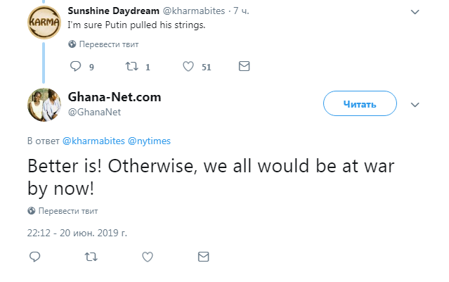 "Это Путин его пыл умерил", "И хорошо, иначе мы все бы уже давно погрязли в войне" - рассуждают пользователи Sunshine Daydrea и Ghana-Net.com, очевидно, ссылаясь на недавнее заявление главы России, сделанное во время прямой линии с президентом, о том, что удар США по Ирану дорого обойдется всем.