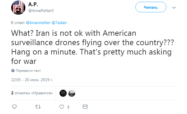 "Что? Иран не устраивает то, что американский беспилотник пролетел над его территорией? Минуточку. Так этого же достаточно, чтобы начать войну", - саркастично высказывается пользователь под ником A.P.