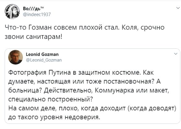 Гозман на своей странице в Twitter спросил у подписчиков, настоящая или постановочная фотография Владимира Путина в защитном костюме. Он также засомневался и по поводу больницы: или это настоящий медцентр в Коммунарке, или специально построенный для визита президента макет. Политик также выразил сожаление, что настолько не доверяет власти.