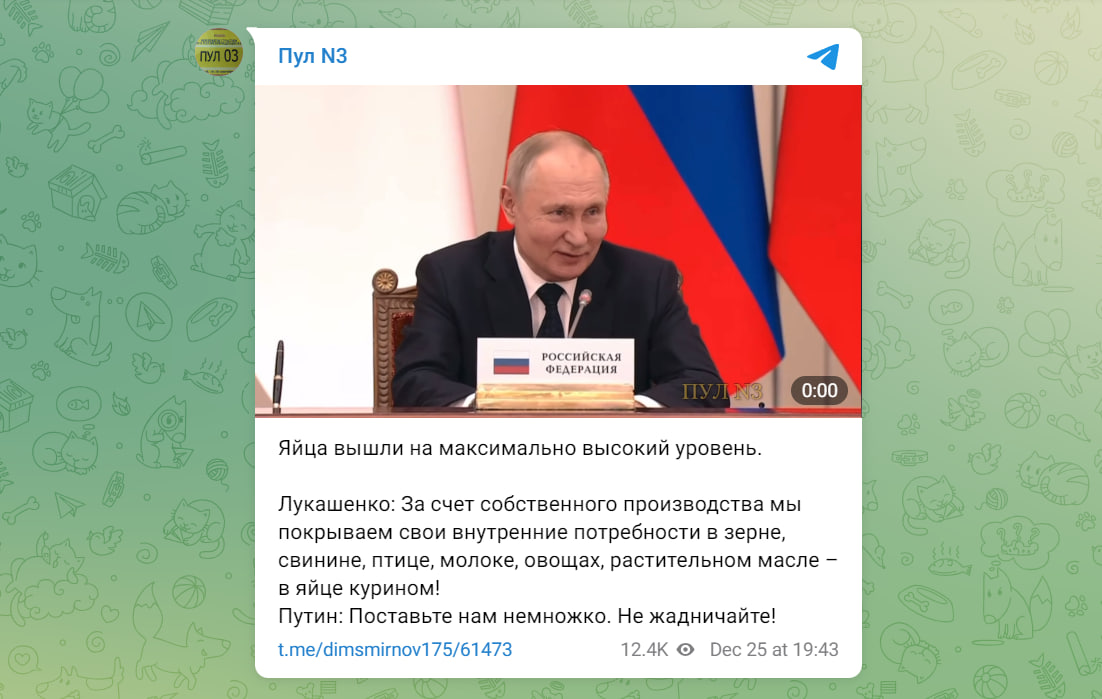 Президент России Владимир Путин с улыбкой отреагировал на замечание белорусского коллеги об обеспеченности республики куриным яйцом.