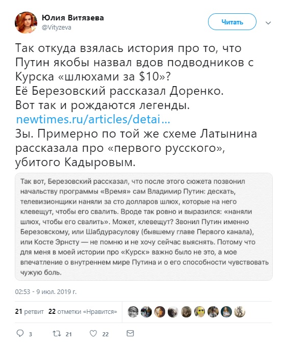 "Так откуда взялась история про то, что Путин якобы назвал вдов подводников с Курска "шлюхами за $10"? Её Березовский рассказал Доренко. Вот так и рождаются легенды. Зы. Примерно по той же схеме Латынина рассказала про "первого русского", убитого Кадыровым", - так звучит полная цитата Витязевой.