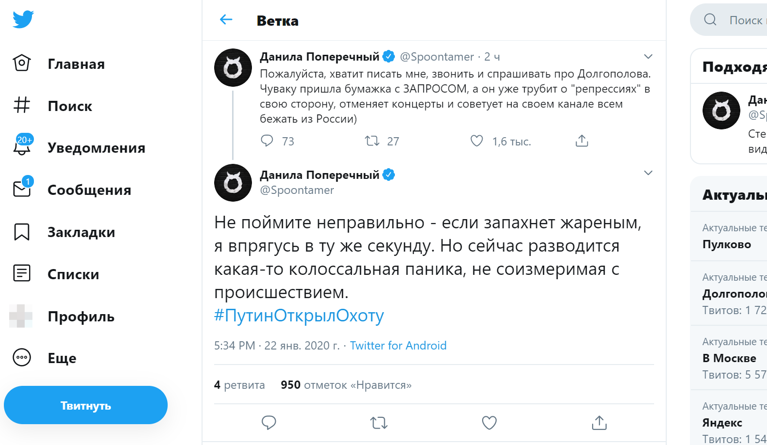 Блогер и стендапер Данила Поперечный не поддержал своего коллегу по юмористическому цеху Александра Долгополова. Он несколькими твитами высмеял возмущение молодого артиста. "Сейчас разводится какая-то колоссальная паника, не соизмеримая с происшествием", - отметил Поперечный, заканчивая сообщение ироничным хештегом, который так любят "навальнята" и их единомышленники: "Путин открыл охоту".