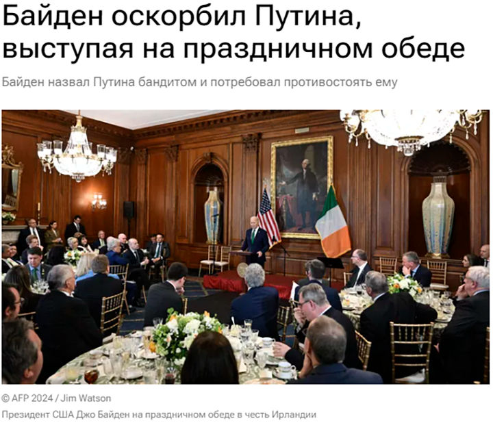 Президент США не раз остро высказывался в адрес своего русского коллеги. В ходе публичного выступления, посвящённого Дню святого Патрика, Джо Байден назвал Владимира Путина "бандитом". Это не первый раз, когда главное лицо Америки обращается к лидеру России в таком ключе: в феврале на мероприятии в Калифорнии он назвал его "сумасшедшим сукиным сыном". Так теперь выглядит "большая дипломатия"?