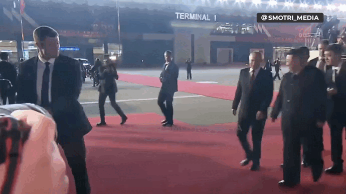 Путин и Ким Чен Ын прошли от трапа по выстеленной красной ковровой дорожке, по обеим сторонам от которой были выстроены бойцы почётного караула. Лидеры двух стран немного поговорили, а затем уехали в одном "Аурусе".